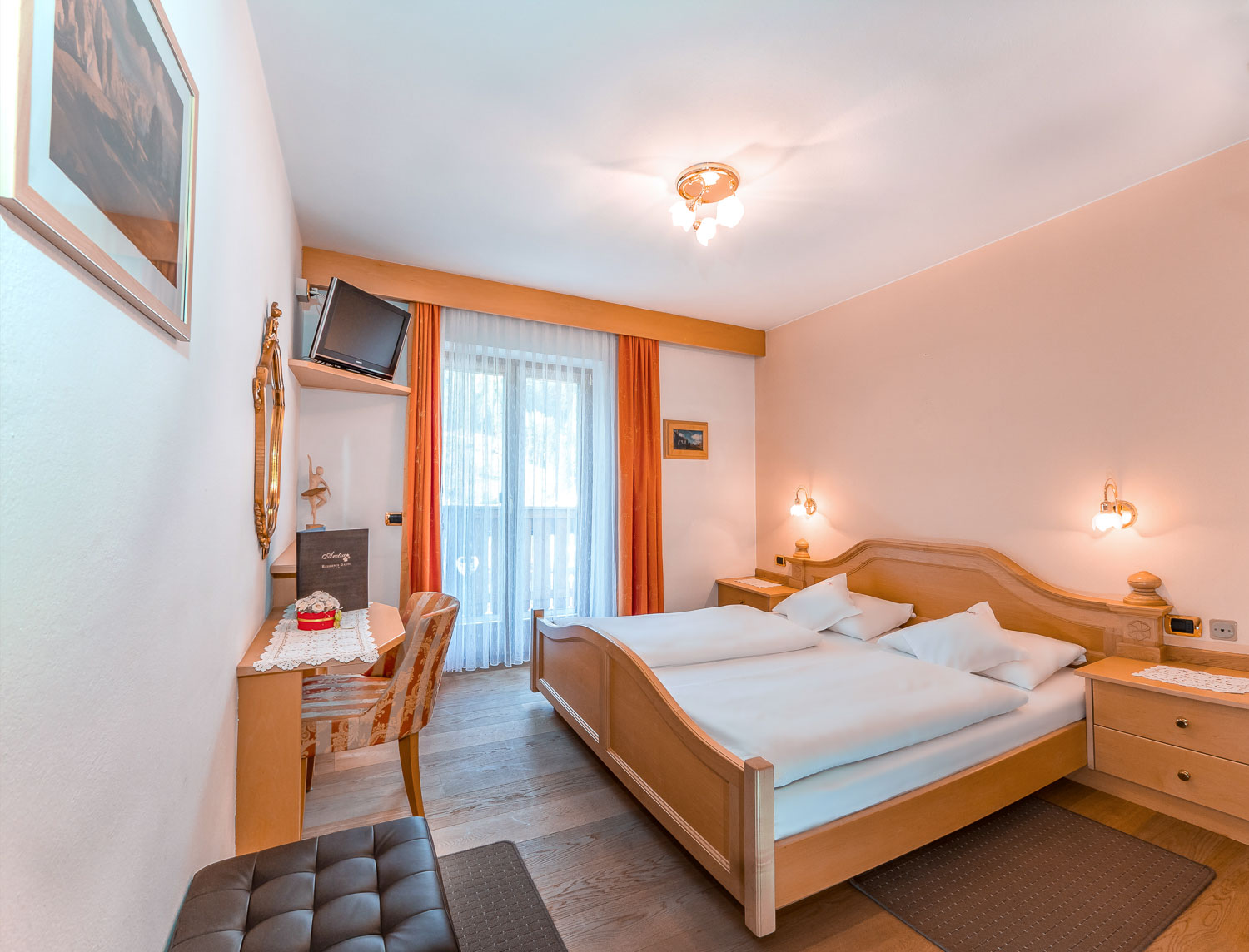 ...bedrooms, furnished with all possible comforts, are perfect for spending pleasant vacations and have everything that a demanding guest may need. From the balconies you may enjoy the panoramic view to one of wonderful views to one of the best known peaks of the Dolomites – the Sassolungo. All double rooms have of a flat screen digital/sat TV, safe, WI-FI and a balcony. The bathroom is equipped with shower-cubicle and hair dryer.